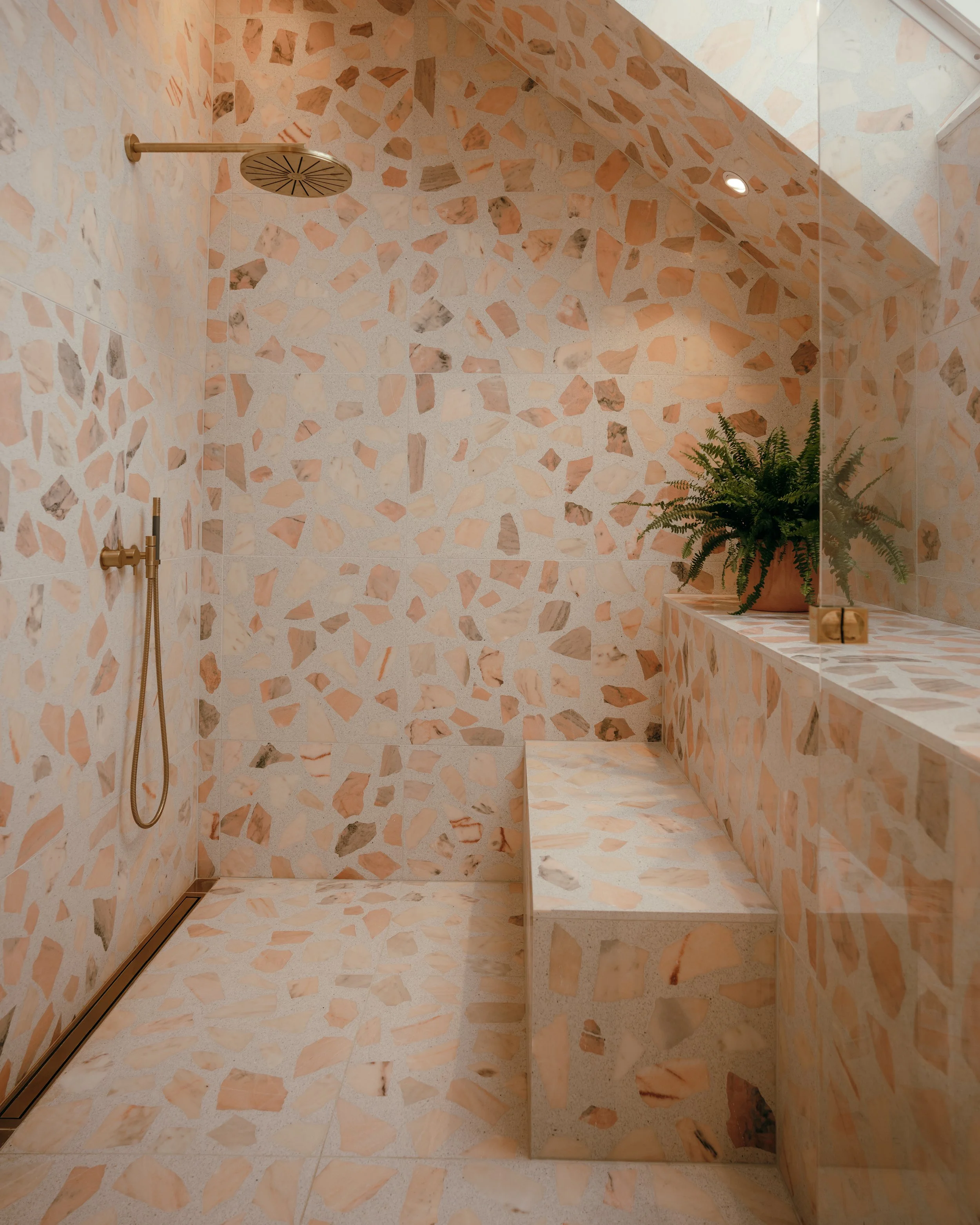 DAMPBAD MED INDBYGGET BÆNK af terrazzofliser fra Mosaic Factory. De naturlige materialer kombineret med messingarmaturer fra Vola og dæmpede farver skaber en stmning af wellness, som familien ønskede sig.