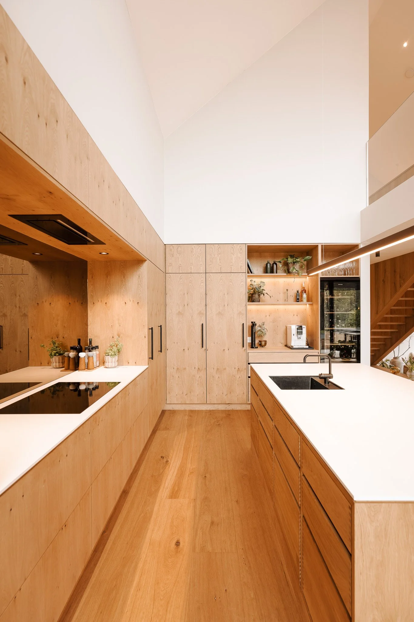 ”Man skulle kunne tale med hinanden, uanset om man var ovenpå eller nedenunder. Derfor er der i vores køkken og i den nedsænkede stue loft til kip med næsten otte meter til loftet, hvilket giver en superfed følelse, når vi er på hver vores plan og taler til hinanden,” siger hun of fortsætter: ”Med muligheden for at få en fantastisk udsigt ud over Silkeborg Søerne, var det vigtigt for os, at vi kunne komme op i højden, men ifølge lokalplanen måtte huset ikke bygges som et to-plans hus. Vi arbejdede derfor på, hvordan vi kunne opnå vores ønsker, kombineret med kravet om, at huset skulle bygges som et halvandet plan hus - og her var Ardess virkelig dygtige til at se muligheder.”