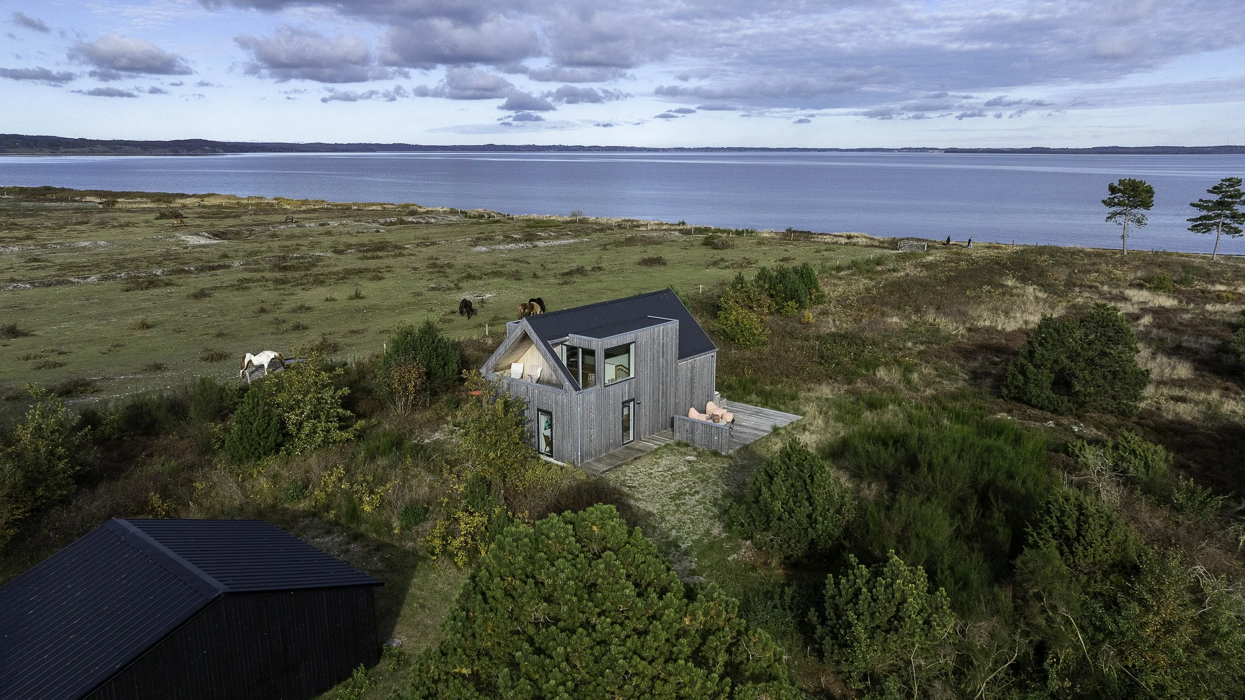 Den grå sølvfarvede nuancer fra det cedertrædækkede tag og facader smelter ind i det naturlige landskabs toner.